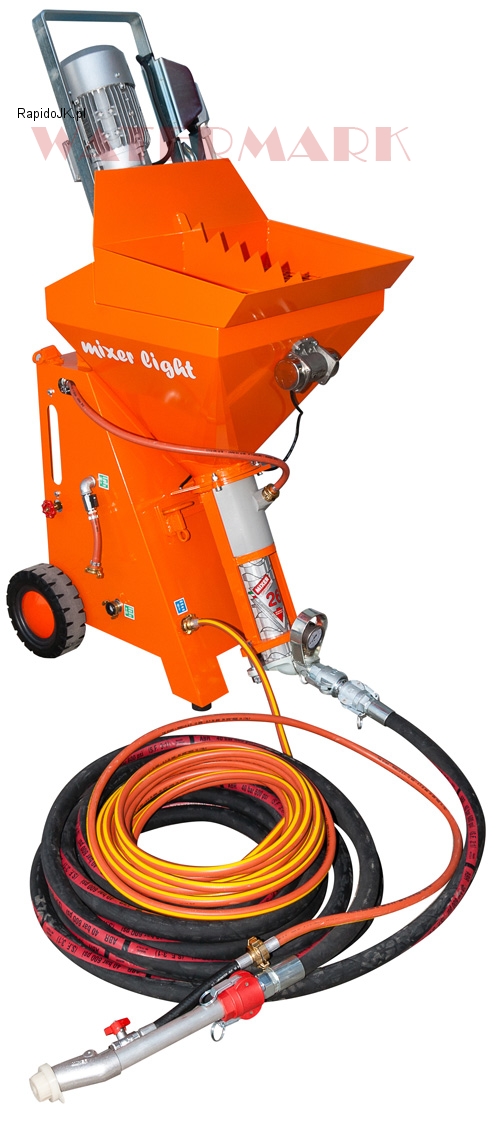 Pompa do mieszania ciągłego o wyjątkowo zwartej budowie, zmniejszonym ciężarze i rozmiarach. Urządzenie można łatwo zdemontować na 3 części na czas transportu. Służy do natryskiwania produktów półpłynnych, np. powłok powierzchniowych tynkowych, na bazie wapna i cementu itp.